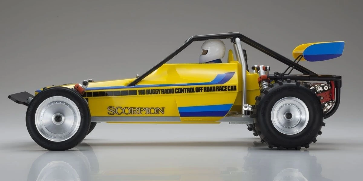 The legendary Kyosho Scorpion is credited with taking the racing buggy category into the realm of pure motorsports. Even after 30 years since it was first released in 1982, the indelible mark of the Scorpion still exists with its many fans around the world. Kyosho is proud to renew this machine to all its former glory! While maintaining the wild and free spirit of the original baja buggy style and chassis layout, the 2014 version features the latest in performance technology and sacrifices nothing in speed and endurance on modern buggy racing tracks.