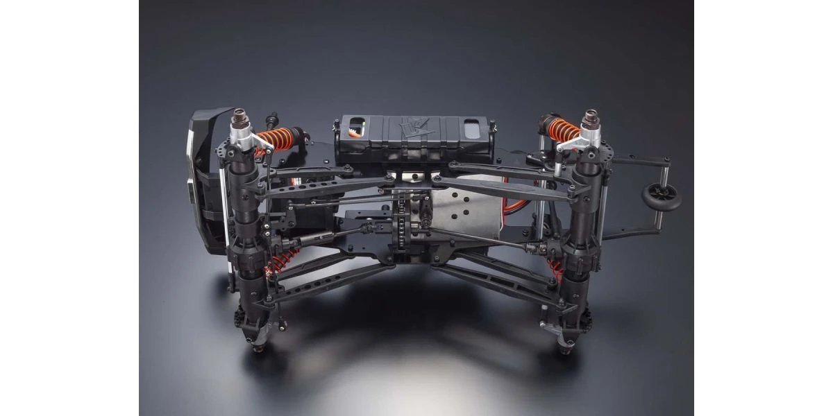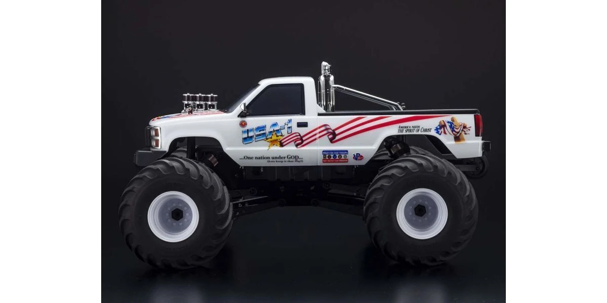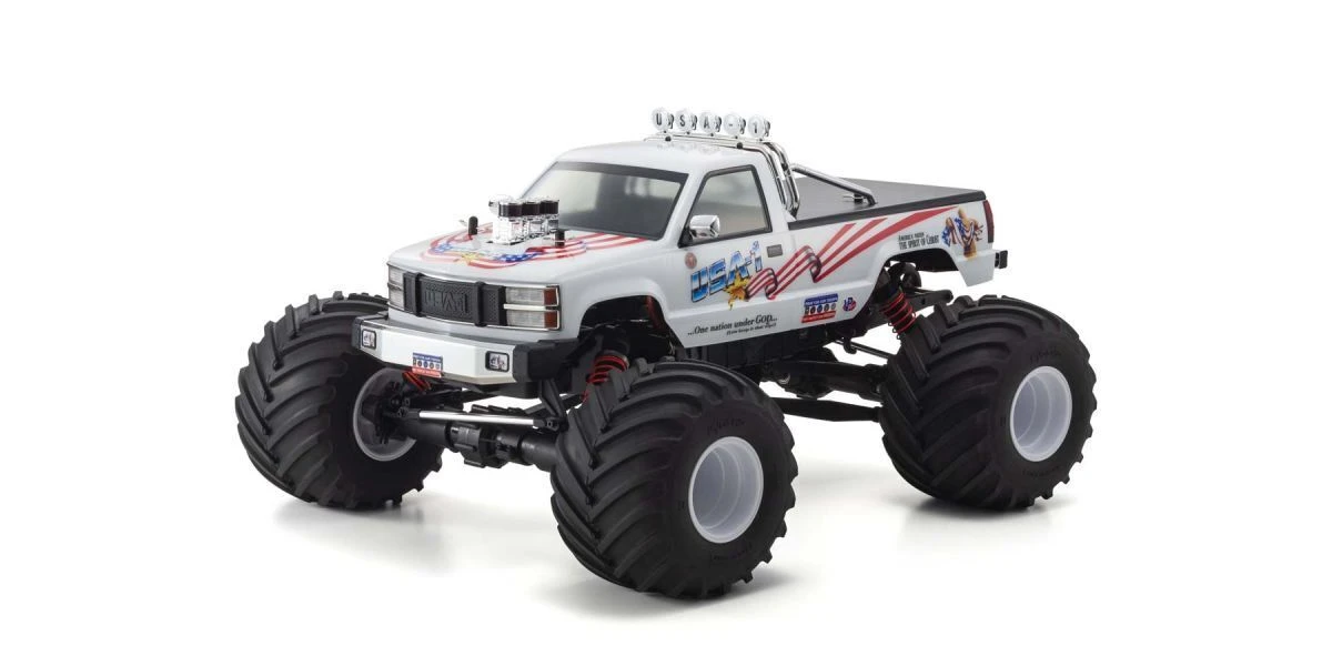 Born in the USA, the monster truck symbolizes America: big, bold and powerful! With pickup truck bodies emblazoned with dynamic motifs mounted on super tough chassis structures and big engines to power huge tires, monster truck racing filled and thrilled stadiums around America and the world with their awesome power and speed. Recreated in 1/8 scale as an R/C truck, the “USA-1” flies the American flag loud and proud as the recognized symbol of monster trucking. Dating back to the 1990’s, Kyosho’s earlier versions have been fully renewed with a newly created ULTRA SCALE body, uniquely reinforced 5-link suspension and stronger solid axles originally used on the Mad Crusher and FO-XX 2.0. Equipped with a high-power brushless motor with a 4-pole rotor and 12-slot stator generating 2300KV, the VE (electric power version) delivers outrageous speed and power characteristics that would rival that of the real USA-1. The high-powered unit produces dynamic performance that makes the large 570mm body length of the USA-1 feel smaller with acceleration pickup from a standing start surpassing that of the GP (engine powered) version. As a pre-assembled Readyset, the body is immaculately finished with paint and livery to capture the rich sense of scale of this iconic 1990’s machine. A charged motor battery and batteries for the transmitter are all that is required to start the action. With spare parts and a wide range of optional parts available to continually maintain and enhance performance, your USA-1 will provide thrilling fun over a long time.