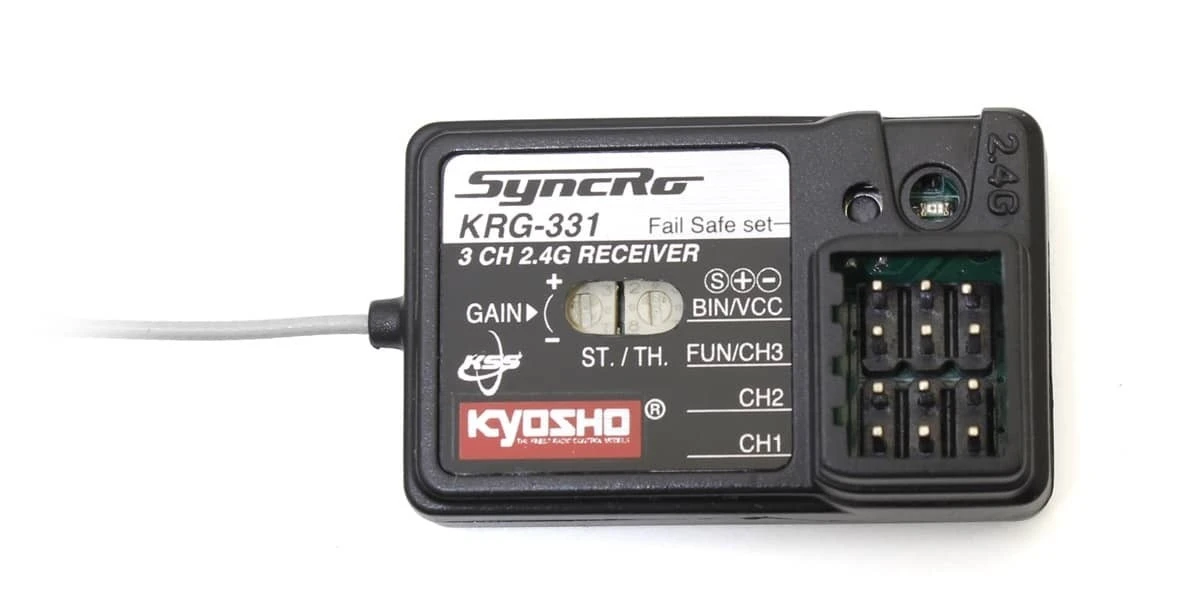 [Transmitter/KT-231P+] – The 3-Channel transmitter operates on 2.4GHz and requires no frequency band control. Non-stepped (continuous) adjustment provides precision setting of ˜Throttle Trim’ to ensure the car doesn’t move unnecessarily, ˜Steering Trim’ to adjust the car’s straight line running, ˜Throttle Endpoint Adjust’ to set the amount of movement on forward and brake input and ˜Steering D/R Adjuster’ to adjust the steering control angle. Requires 4 x AA size alkaline batteries.The KRG-331 receiver with built-in gyro features the KSS (Kyosho Stability System), which straightens driving lines when steering control is affected on slippery or uneven roads and prevents spinouts during cornering, ultimately realizing faster lap times. The traction correction function also allows you to exit through corners at higher speed. Since the user can adjust the correction rate to their preference, settings can be made according to the road surface conditions and the type of vehicle.