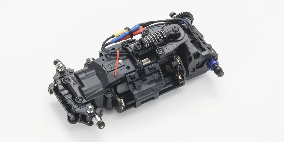 16 times faster than the previous ASF 2.4GHz system + KT-18 transmitter combination and 4 times faster than the ASF 2.4GHz system + KO PROPO EX-1 combination, the ultrafast response of the MHS 2.4GHz system and the MR-03VE Pro chassis set is ideal for JSCC class racers in the MINI-Z Cup. With its performance defining midship motor mount, new MM2 motor case allows the longer (94mm) wheelbase to be used. The existing MM motor case design can be used with the LL (98mm), 3L (102mm) and 4L (106mm) wheelbases, but the new MM2 motor case can be used with L, LL and 3L wheelbases. Also, compared to the existing RM motor case, mass balance is optimized to improve cornering performance and minimize tipping due to high side on hybrid surfaces. These performance features provide a huge advantage in the JSCC class with the narrow body required by the regulations. In addition, axle adjustment spacers allow changes to the rear axle shaft height and together with the new plastic friction shock, precision setting according to road surface conditions are possible. The benefits of the MM2 motor case combine with the ultra-responsiveness of the MHS2.4GHz system in the advanced MR-03VE PRO chassis for psychokinetic-like response and a linear control feeling that realizes the ultimate goal of improved lap times.